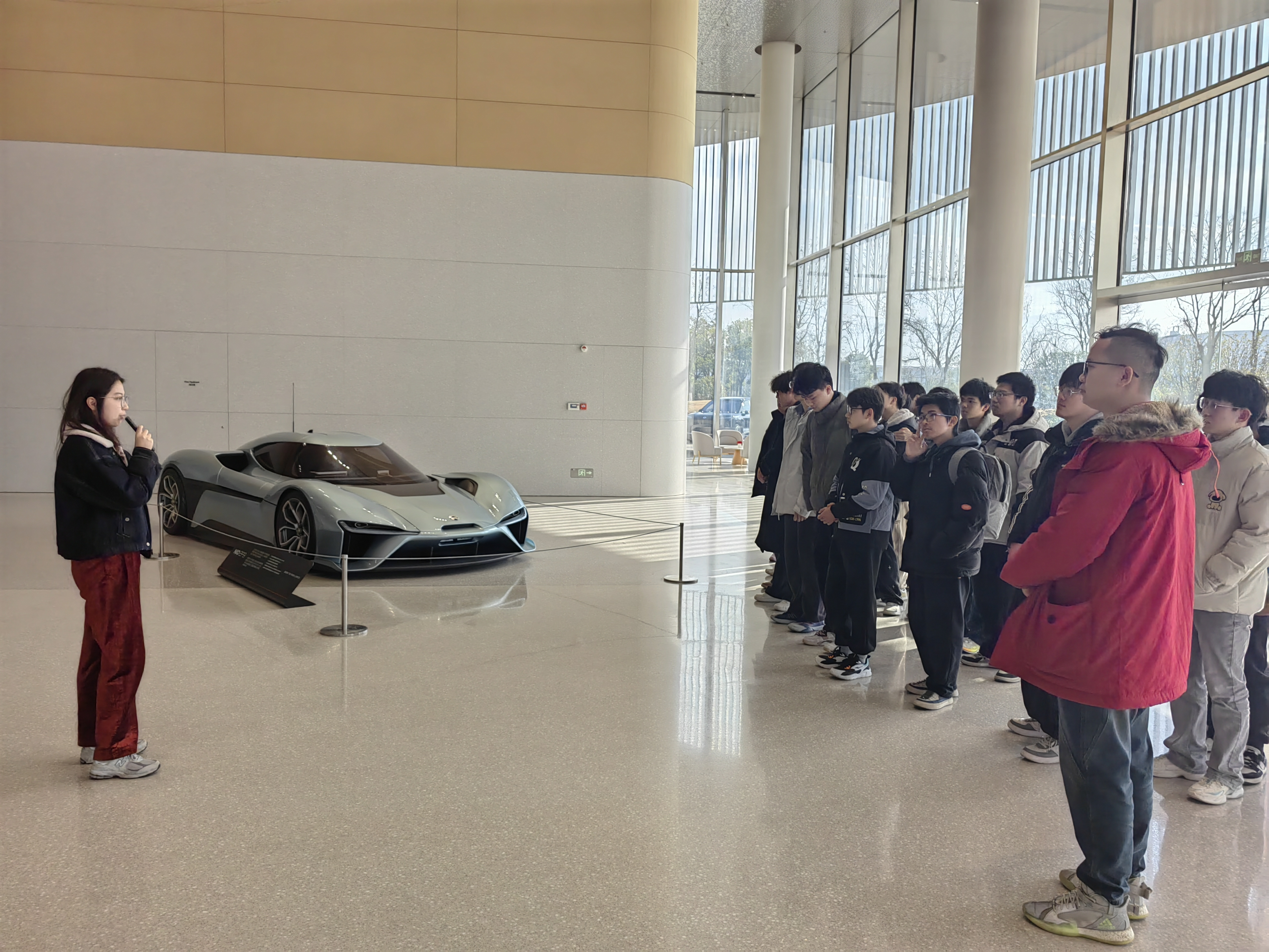 在蔚来工作人员的热情接待下,师生一行首先走进全球最大的 NIO House 展厅。作为集展示、体验、交付于一体的零碳绿色空间,展厅内前沿的车型技术、创新的用户服务生态及 NIO Life 全品牌集合体验区,让同学们直观感受了新能源汽车产业的发展活力与品牌魅力。随后,师生通过专属空中参观连廊深入汽车生产车间,沉浸式体验世界级智能工厂的制造实力。