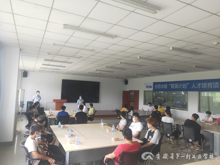到达企业后,海尔公司开展了安徽省第一轻工业学校顶岗实习同学见面会,对同学们的到来表示欢迎,并为同学们介绍了海尔公司概况。见面会上,张忍东老师也教导同学们要努力工作,并对同学生的实习生涯寄予祝福。