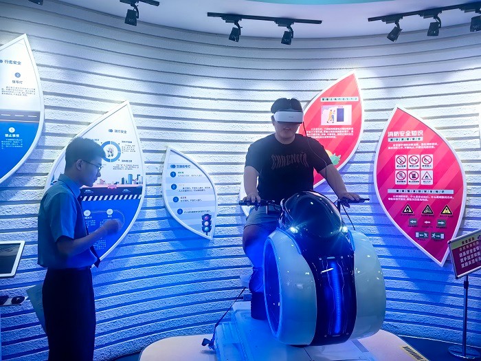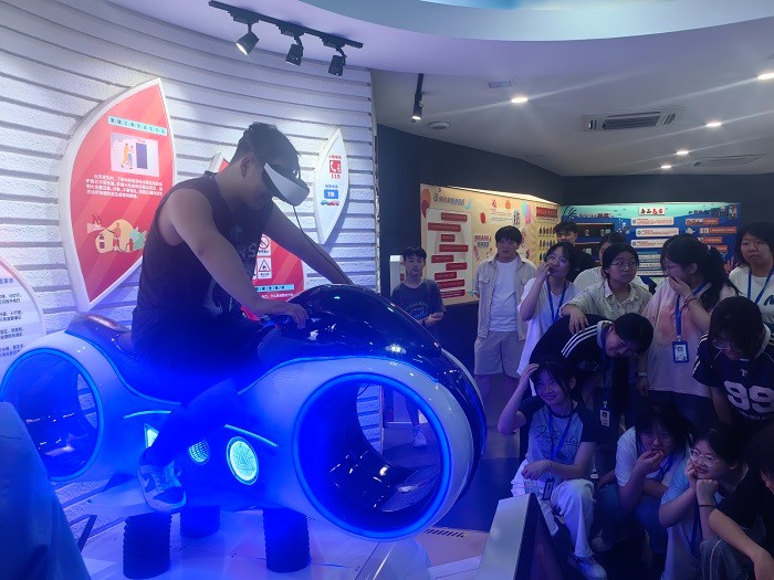 醉驾模拟器体验中。在工作人员的指导下,学生们戴上模拟醉酒状态的特殊眼镜,尝试在“醉驾”状态下操作设备。尽管只是模拟体验,但“醉酒”后头晕目眩、行动迟缓的感觉,让学生们真切感受到醉驾的危险性。