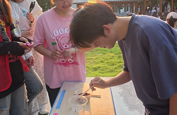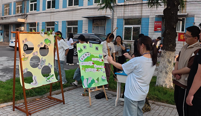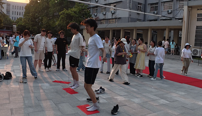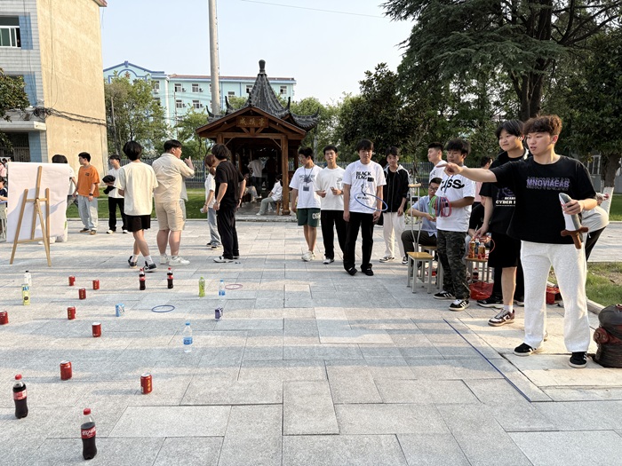 “智勇双全竞风流”:竞技比拼展风采。这里是智慧与勇气的试炼场。源自古代礼仪的投壶比赛现场,同学们凝神静气,手持羽箭,瞄准壶口。每一次精准投入都赢得围观者的喝彩;“四仪踏云”活动不仅考验参与者的平衡感与默契度,其名称更暗含对传统礼仪的敬意与对美好生活的向往,同学们步履轻快,现场妙趣横生;结合端午驱邪避害传统的“射五毒”比赛人气高涨。同学们以特制“弓箭”瞄准画有蛇、蝎、蜈蚣、壁虎、蟾蜍图案的标靶射箭。每一次“命中”,都寄托着大家对祛除病害、祈求健康的美好愿望,现场气氛热烈欢腾;在考验耐心与手部精细动作的夹红豆比赛中,选手们屏息凝神,用细长的筷子在限定时间内争分夺秒地将圆润的红豆夹入指定容器。方寸之间,尽显专注与技巧,紧张而专注的氛围感染着每一位参与者。类似的还有双拍持球、趣味保龄球、套圈、趾压板跳绳、五子棋、沙包投掷等比赛,让同学们在欢声笑语中深化友谊,增强了集体归属感。这些游戏项目考验着现场同学们的团队协作与身体素质。参赛同学们全情投入,默契配合,为集体荣誉奋力拼搏。紧张激烈的角逐中,加油呐喊声此起彼伏,青春的活力与激情在此刻尽情释放。
