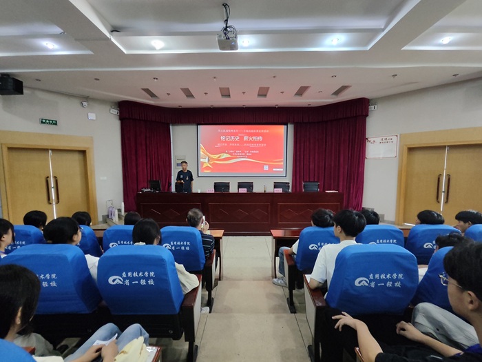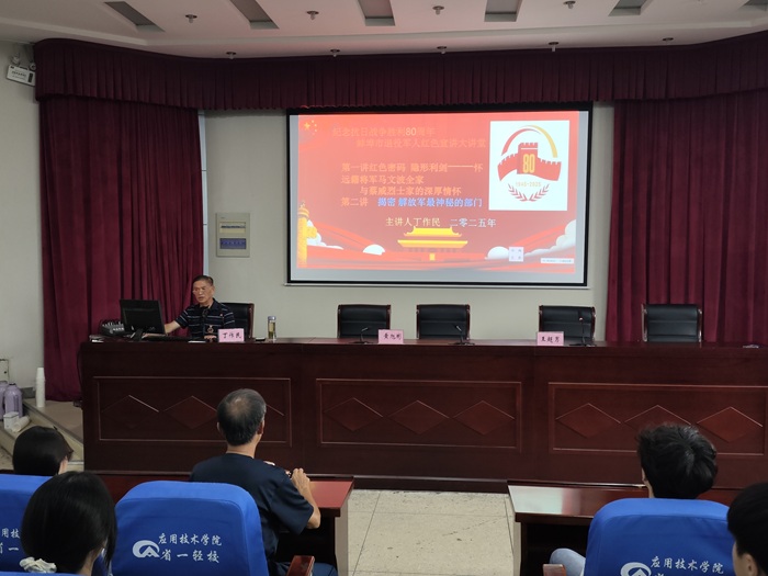 在中国人民抗日战争暨世界反法西斯战争胜利80周年的重要历史时刻,2025年9月1日下午3时,我校团委联合高新区秦集镇文竹苑社区团支部,共同举办了一场以"铭记历史 薪火相传"为主题的国防教育讲座。本次活动特别邀请两位从军营到讲堂、从沙场到书房的英雄前辈——高新区综合执法局退休支部党支部书记丁作民同志和蚌埠市高新区社会事业局原局长、党委书记黄旭彬同志,为全校新生带来一场别开生面的国防教育课。