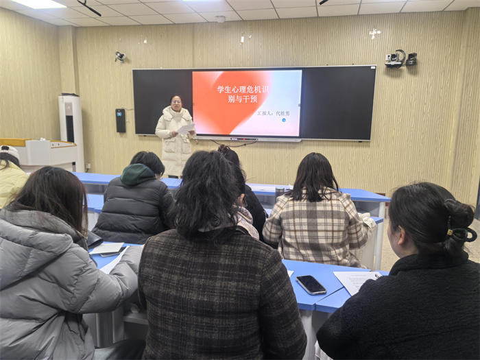 为进一步加强班主任队伍专业化建设,提升教师心理健康教育能力,切实筑牢校园安全防线,我校于2月19日在智慧教室组织开展"学生心理危机识别与干预"专题培训。本次培训由心理教师代胜男主讲,全体班主任及学生处工作人员参与学习。