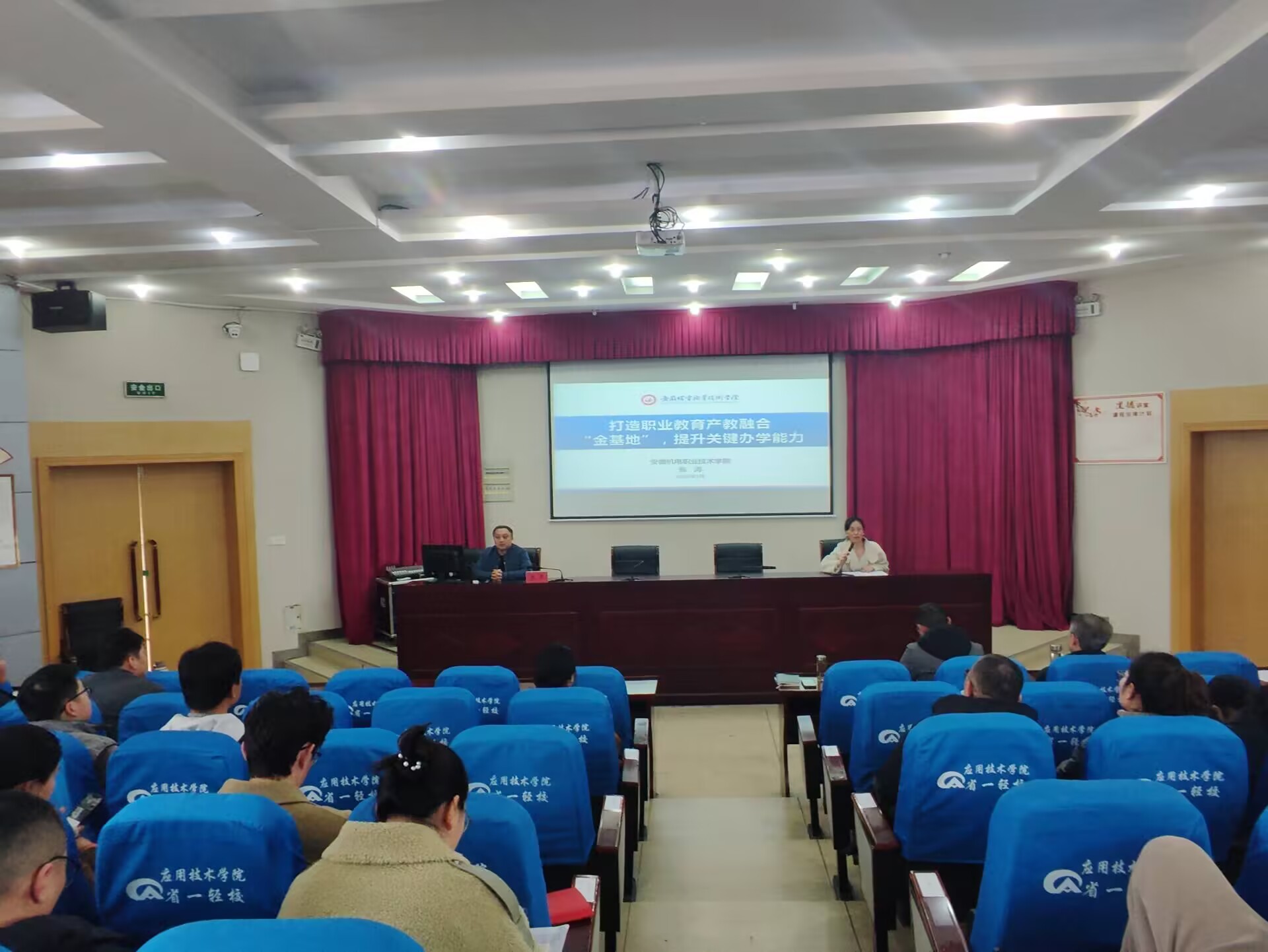 2025年3月19日下午,安徽机电职业技术学院科研处副处长张涛受邀在我校学术报告厅以“打造职业教育产教融合金基地,提升关键办学能力”为题作专题讲座。此次讲座聚焦教育思想大讨论之“职业教育与产业深度融合的创新实践”,会议由教务处主任申琳琳主持。