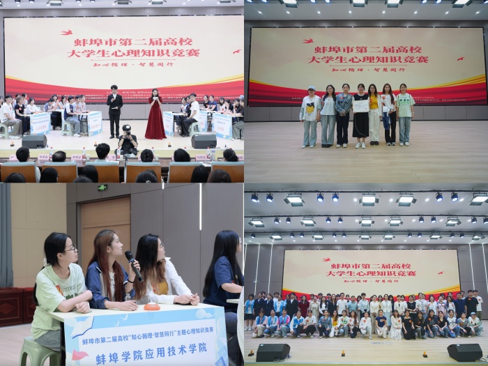校际竞赛展风采,团队协作绽光芒。在蚌埠市第二届高校大学生心理知识竞赛团体赛中,我院学生代表队凭借扎实的知识储备和出色的团队协作能力,与其他高校选手同台竞技。赛场上,队员们分工明确、配合默契,在抢答、必答和风险题等环节中沉着应对,充分展现了学子良好的精神风貌和专业素养,为校争光的同时,也促进了校际间的心理健康教育交流。