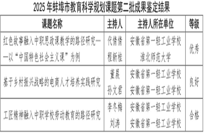 近日,蚌埠市教育局公布2025年市教育科学规划课题第二批成果鉴定结果,我校申报的三项市级课题全部顺利通过结题验收。代倩倩主持的课题《红色故事融入中职思政课教学的路径研究——以“中国特色社会主义课”为例》获评优秀;董晨、孙文君主持的课题《基于乡村振兴战略的电商人才培养实践研究》获良好;李冬梅、刘涛主持的课题《工匠精神融入中职学校劳动教育的路径研究》为合格。