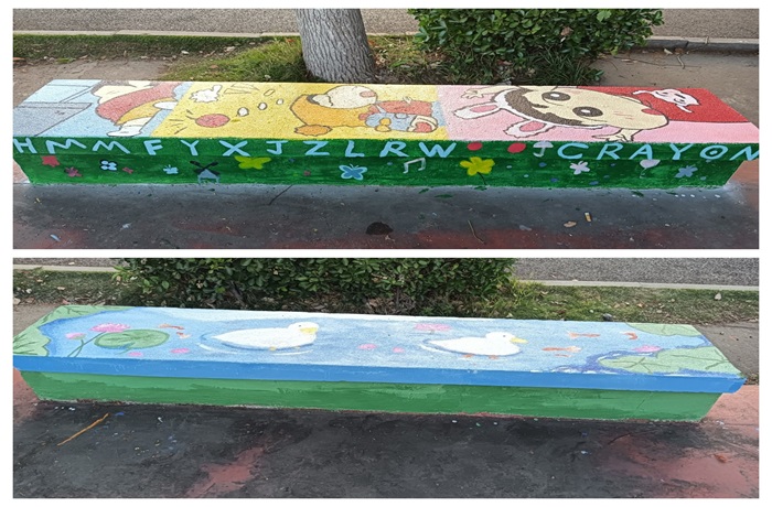 同学们在美术教师的指导下,设计绘制图案,展示精巧构思,共同合作美化了校园内25张石凳。生动活泼的文化氛围感染了师生们,大家纷纷驻足观赏,打卡拍照留念。