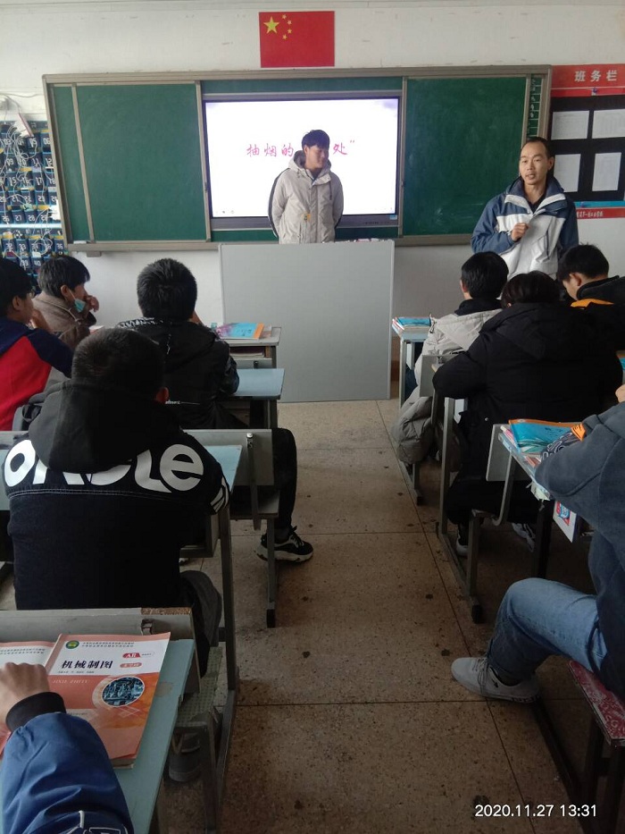 为创建文明整洁的校园环境,提高同学们对吸烟有害身体更深刻认识,增强同学们的社会责任感,安徽省第一轻工业学校20秋机电数控班于11月27日下午12:30隆重召开关于抽烟的“好处”为主题的班会。 本次班会由徐建航、朱金峰、王子旭、邵灿、李嘉俊主持,班主任张老师和王顺同学作为特邀嘉宾。