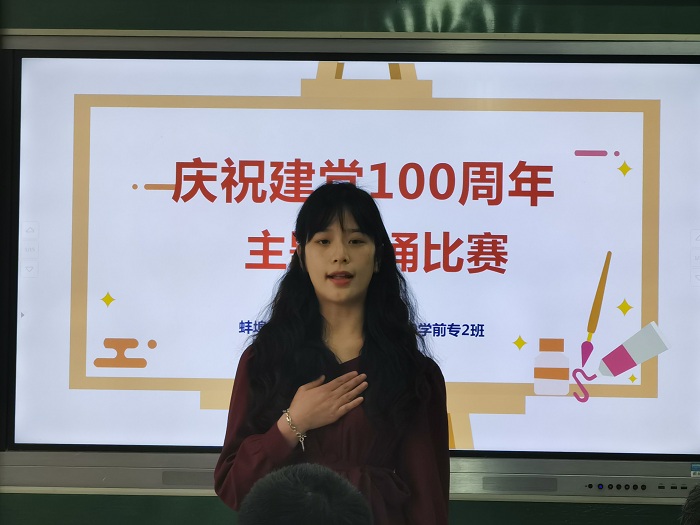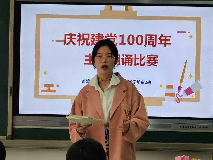 为了庆祝建党一百周年,营造浓郁的校园文化氛围,丰富同学们的业余文化生活,激发广大学生的爱国之情,4月23日,20学前教育专2班开展了以 “庆祝建党百年,传承红色经典”为主题的党史诵读竞赛活动,做到知史爱党、知史爱国,增进爱党之情,常怀爱党之心。