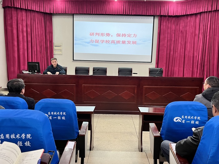为进一步落实立德树人根本任务,强化党建引领作用,凝聚党员力量,扎实推进职业教育改革创新,3月19日下午,安徽省第一轻工业学校党委副书记方军,在学术报告厅为全体党员讲授题为《研判形势 保持定力——力促学校高质量发展》的专题党课,全体党员参加学习。
