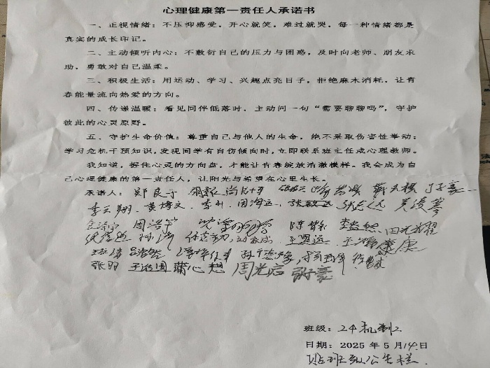 为正确引导学生认识和管理情绪,提升心理健康水平,5月14日,我校组织各班开展了以“我的情绪我做主”为主题的心理健康班会活动。此次活动旨在帮助学生掌握情绪调节方法,树立积极健康的心态,并通过签署 “心理健康第一责任人承诺书”,强化学生对自身心理健康的责任意识。