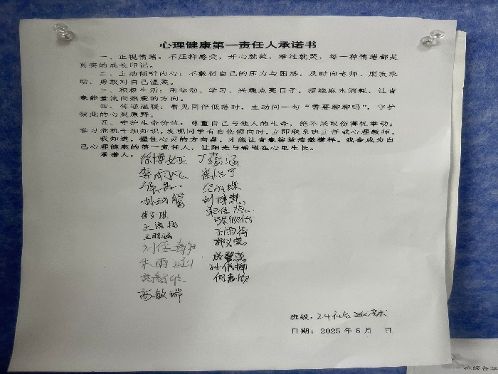 班会课上,各班班主任系统讲解了情绪的产生、分类以及对学习和生活的影响。同学们积极分享日常情绪管理经验,交流应对策略。此次班会的开展,为学生提供了一个学习情绪管理、分享交流心得的平台,有效提升了学生的情绪管理能力和心理健康素养。承诺书签署环节作为活动亮点,通过“承诺—践行”机制有效促进了心理健康教育的内化,这一创新实践为学校心理健康教育体系建设提供了新思路