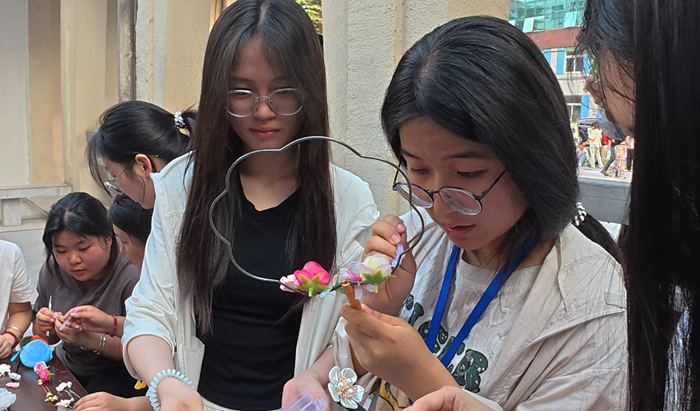 “巧夺天工造物华”:巧手匠心承非遗。这里是一片创意与技艺的天地。同学们纷纷化身“手艺人”,沉浸在传统手工艺的魅力中。在端午香囊售卖区,辩论社的同学们精心挑选布料,巧手缝制,填充艾草香料,一件件寓意吉祥、香气四溢的香囊跃然掌中;在手工编织区域,话剧社的同学用飞舞的指尖,将五彩丝线变幻出精美的绳结与图案;手工饰品制作区,同学们巧妙运用珠子、线绳、花瓣等材料,创作出独一无二的项链、手链、发簪等饰品;在美食畅享区,本科食品专业的同学们,充分发挥专业特色,制作出一份份色香味俱全的蛋挞、饼干、蛋糕、冰粉等,受到了现场师生们的一致好评。每一件作品都凝聚着智慧与匠心,是对传统工艺的生动传承与创新表达。
