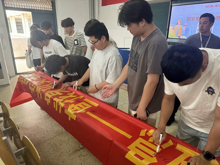 活动现场秩序井然,参赛学生通过扫码答题,围绕安全生产法律法规、消防安全、实验室安全、校园防诈骗等内容答题。题目结合校园实际场景,检验学生安全常识掌握程度,竞赛中大家专注作答,展现良好安全素养。机电工程系学生代表表示,线上竞赛形式新颖,题目案例与学习生活相关,加深了对安全知识的理解。活动设实时排名和答题解析功能,助力参赛者查漏补缺。答题结束后,全体参赛学生在安全主题横幅上签名,以行动践行安全责任。