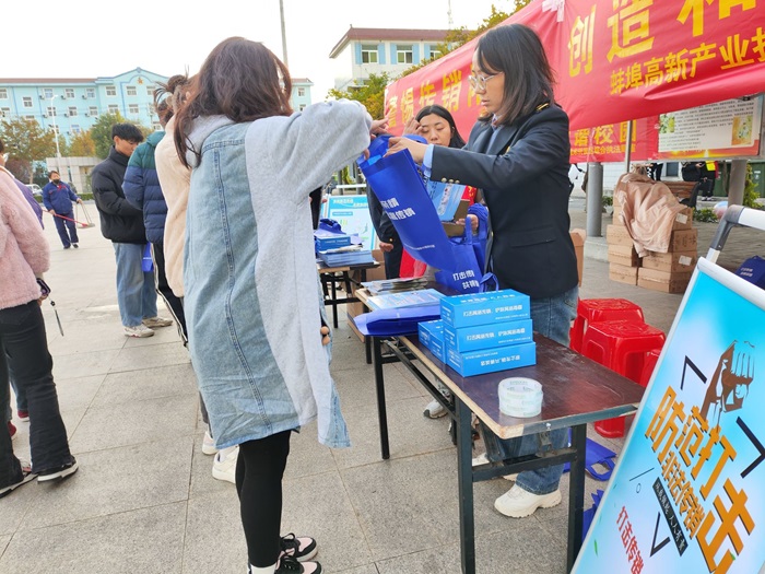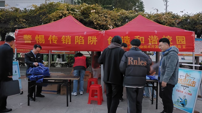 此次活动还设立了教学楼广场分会场,为学生发放防范传销宣传手册,学生们纷纷驻足观看并领取宣传材料。