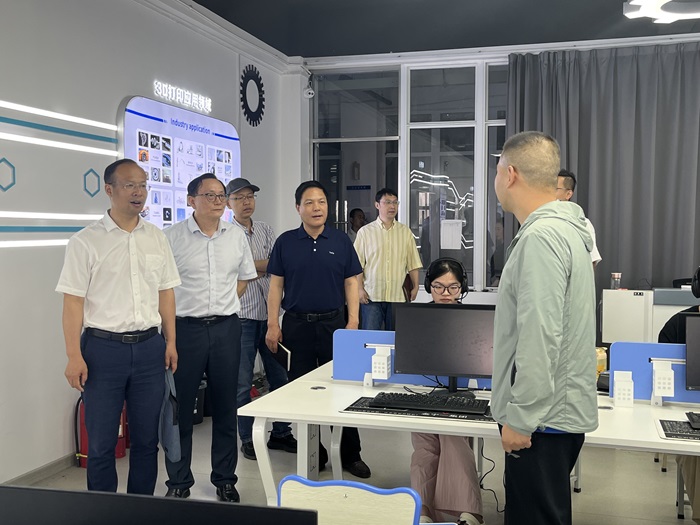座谈会后,在谢红祥和李大胜的陪同下,孙艳辉实地察看了应用技术学院的数控实训基地、3D打印综合应用实训室等场所,并与应用技术学院的教师进行了沟通交流,深入了解学院的实训教学活动。