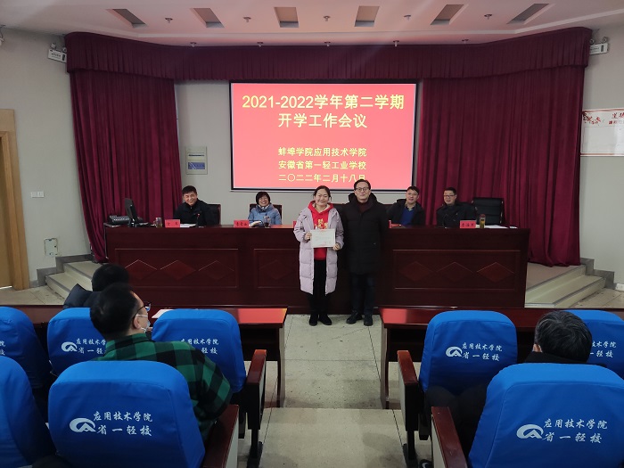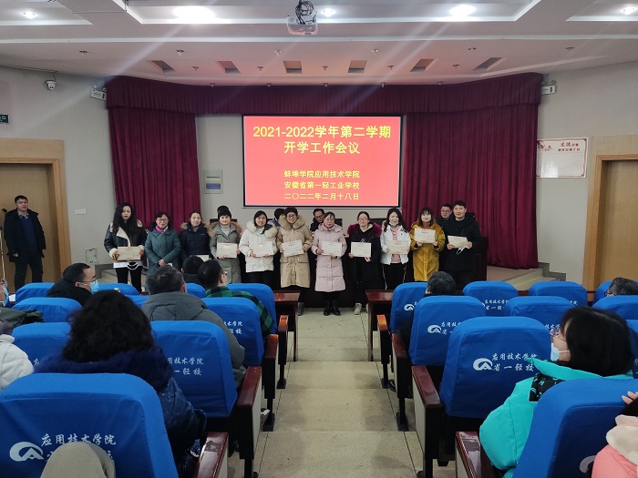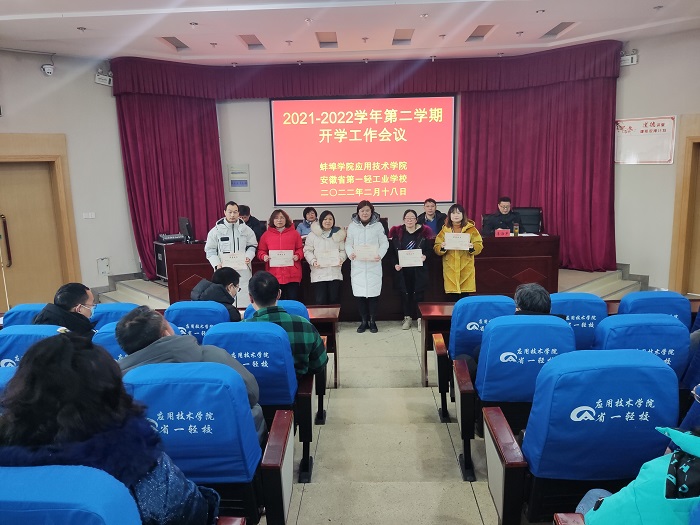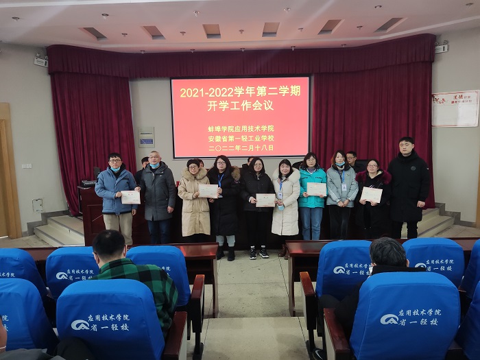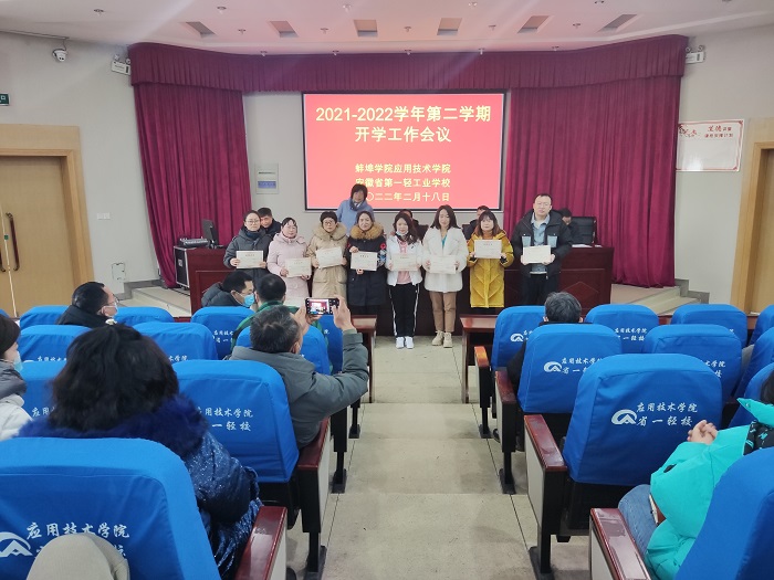 会上方军通报表扬了在上学年工作中表现突出的教职工,并举行了颁奖仪式。本次颁奖包括2020-2021学年“蚌埠市优秀班主任”、“蚌埠市先进班集体”、校级优秀教学教案比赛、校级课程思政教学设计比赛、校级优质课教学比赛、校级优秀教学课件比赛、校级优秀实习指导教师七个奖项,颁奖结束后,学校对新进的五名新进教师进行了“青蓝工程”的结对,并为指导老师颁发了聘书。