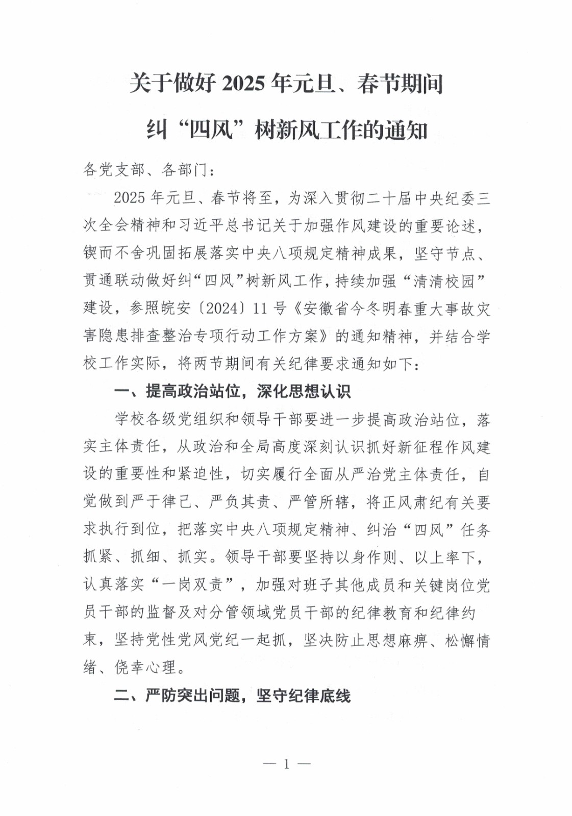 关于做好2025年元旦、春节期间纠“四风”树新风工作的通知