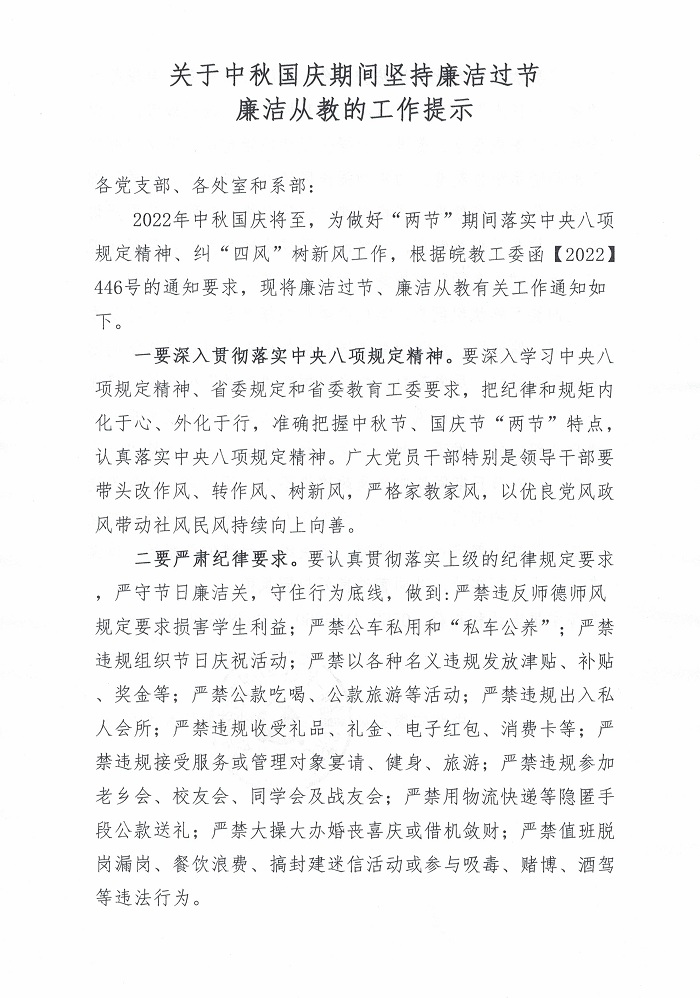 关于中秋国庆期间坚持廉洁过节廉洁从教的工作提示