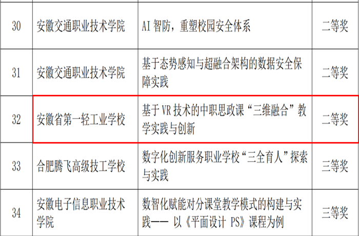 近日,2025 年度安徽省职业与成人教育数字化创新实践典型案例评选结果揭晓,我校《基于 VR 技术的中职思政课“三维融合”教学实践与创新》案例荣获二等奖。