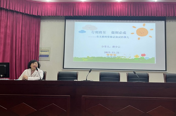 此次讲座的主讲人是蚌埠市禹会区学前教育专业教研员唐少云老师。唐少云具有多年一线幼儿园工作经验,连续多年被聘为蚌埠市教师资格证面试主考官,熟知幼儿园教师资格证面试评分标准与要求。且教学实践丰富,近年来,辅导区内年轻教师幼儿园游戏案例、优质课比赛均获得省级一等奖。