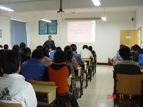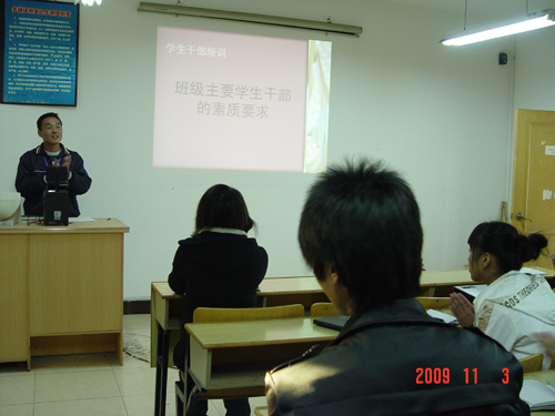为了消除困惑,改进工作,提高素质,切实当好老师同学满意的学生干部,发挥学生干部模范带头作用,更好的成为学校与学生之间沟通的桥梁,2009年11月3日下午,学生处冯登森老师,在多媒体一给全校所有班级的班长和团支部书记作了以“班级主要学生干部的素质要求”为主题的培训讲座。