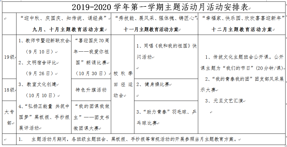 2019-2020学年第一学期主题活动月安排表