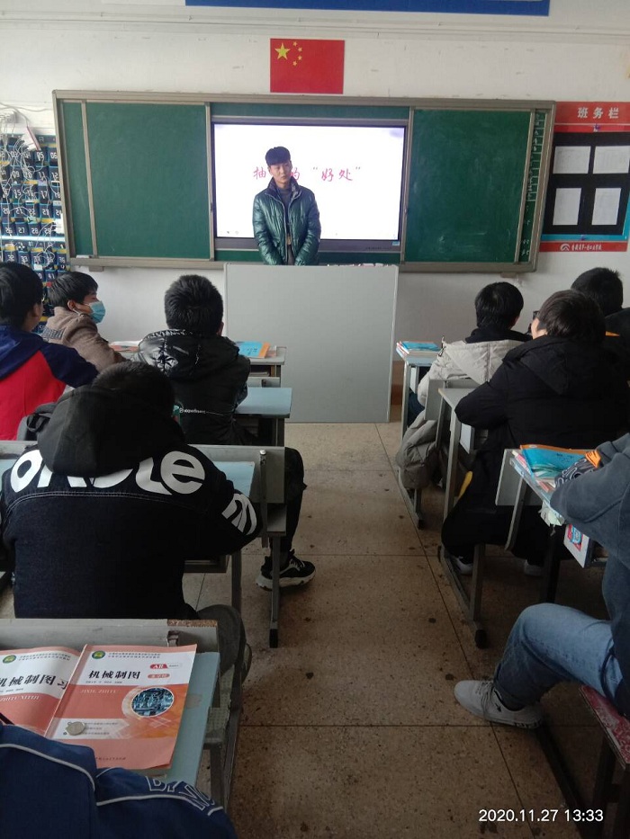 为创建文明整洁的校园环境,提高同学们对吸烟有害身体更深刻认识,增强同学们的社会责任感,安徽省第一轻工业学校20秋机电数控班于11月27日下午12:30隆重召开关于抽烟的“好处”为主题的班会。 本次班会由徐建航、朱金峰、王子旭、邵灿、李嘉俊主持,班主任张老师和王顺同学作为特邀嘉宾。