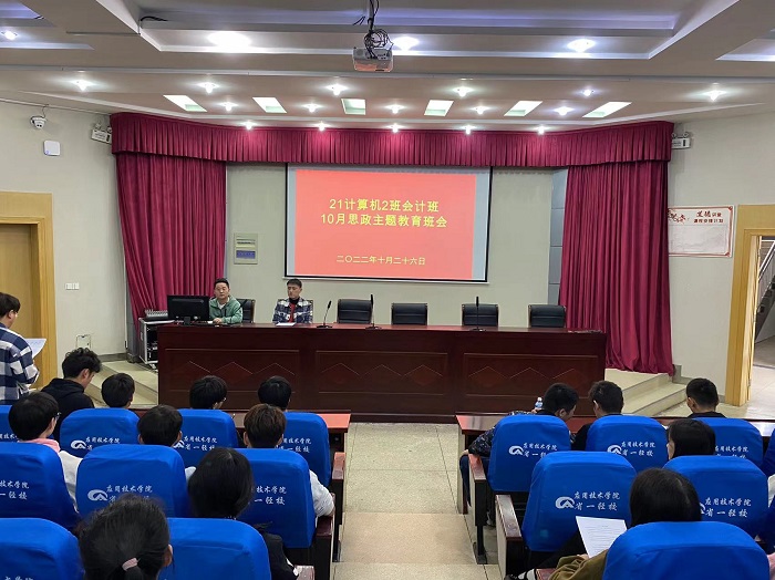 为深入学习党的二十大精神,进一步加强大学生思想政治教育。21会计1、2班,21计算机2班于10月26日在学术报告厅开展“学习二十大,永远跟党走,奋进新征程”主题班会。会议由班主任李运会主持,辅助班主任韩云涛出席会议,班级全体学生参加会议。